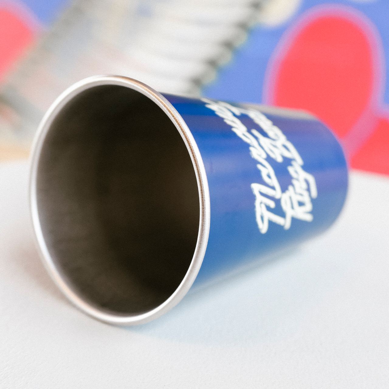 This stainless-steel Darling Blue-themed "MKB Script Party Cup" can hold up to 16 ounces.
